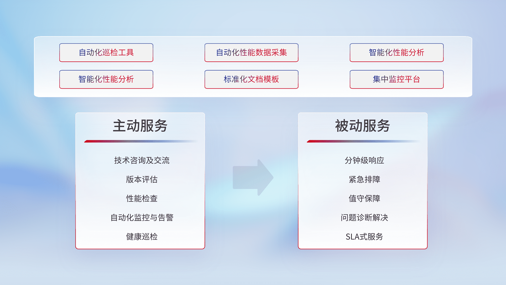智能化工具和标准化文档,,保障服务质量,,提供主动服务(包含技术咨询、、版本评估、、性能检查、、、自动化监控与告警、、健康巡检)和被动服务包含(分钟级响应、、、紧急排障、、、、值守保障、、、问题诊断解决、、、SLA服务)。。