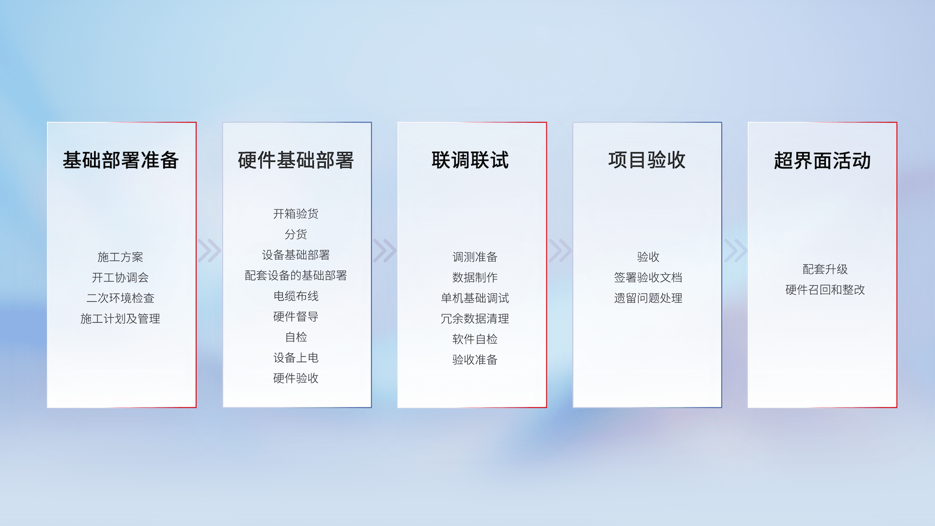 从基础部署准备、、、、硬件基础部署、、、联调联试、、、、项目验收、、、越界面活动的全过程可追溯,,,,保证施工质量和进度。。。
